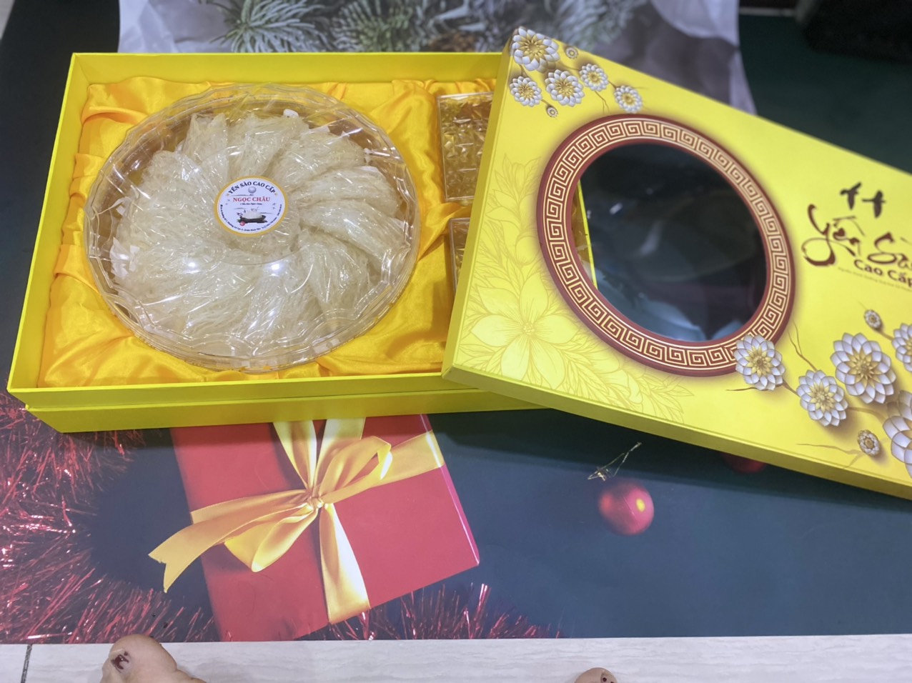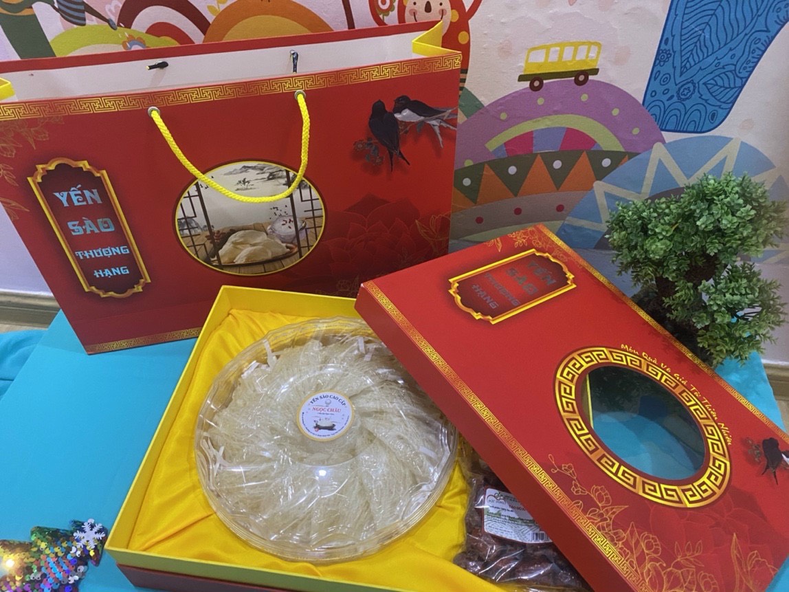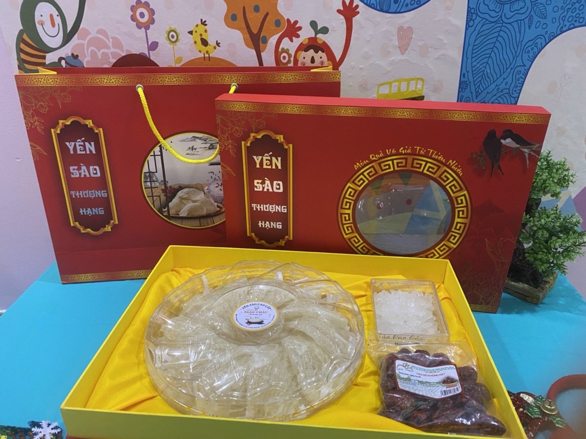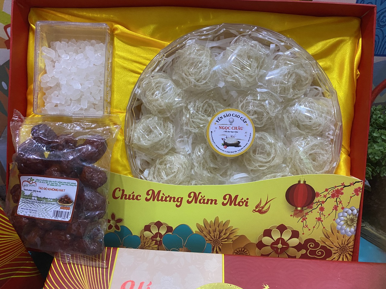 Hộp quà gồm 100g yến tinh chế, 1 hộp táo đỏ, 1 hộp đường phèn với mẫu mã sang trọng, quý phái được xếp vào dòng sản phẩm yến sào cao cấp
